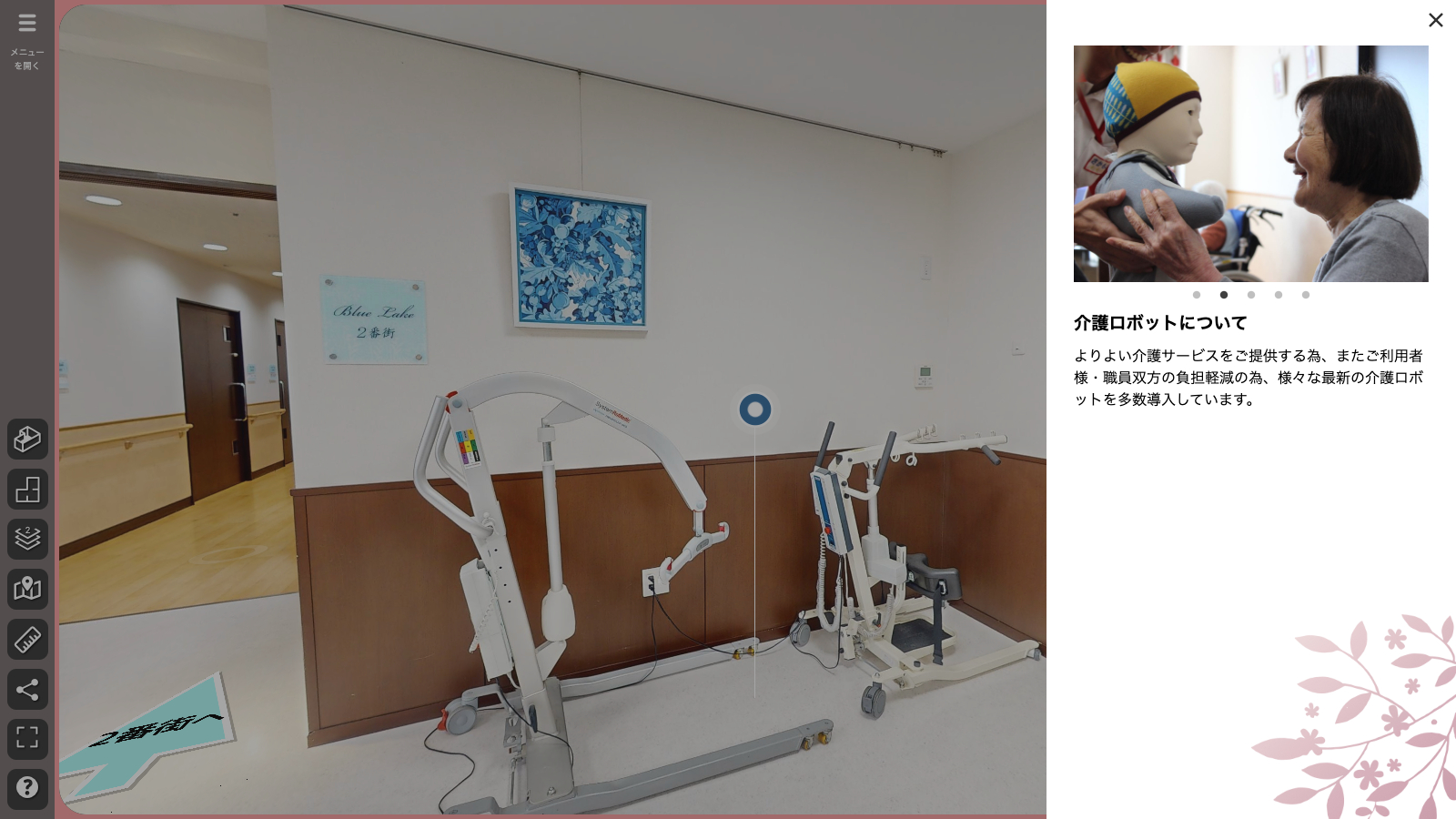 利用を検討されている方にご自宅からでも施設の雰囲気を見ていただけるように、施設全体を丁寧に撮影し様々な情報を埋め込んでいます。