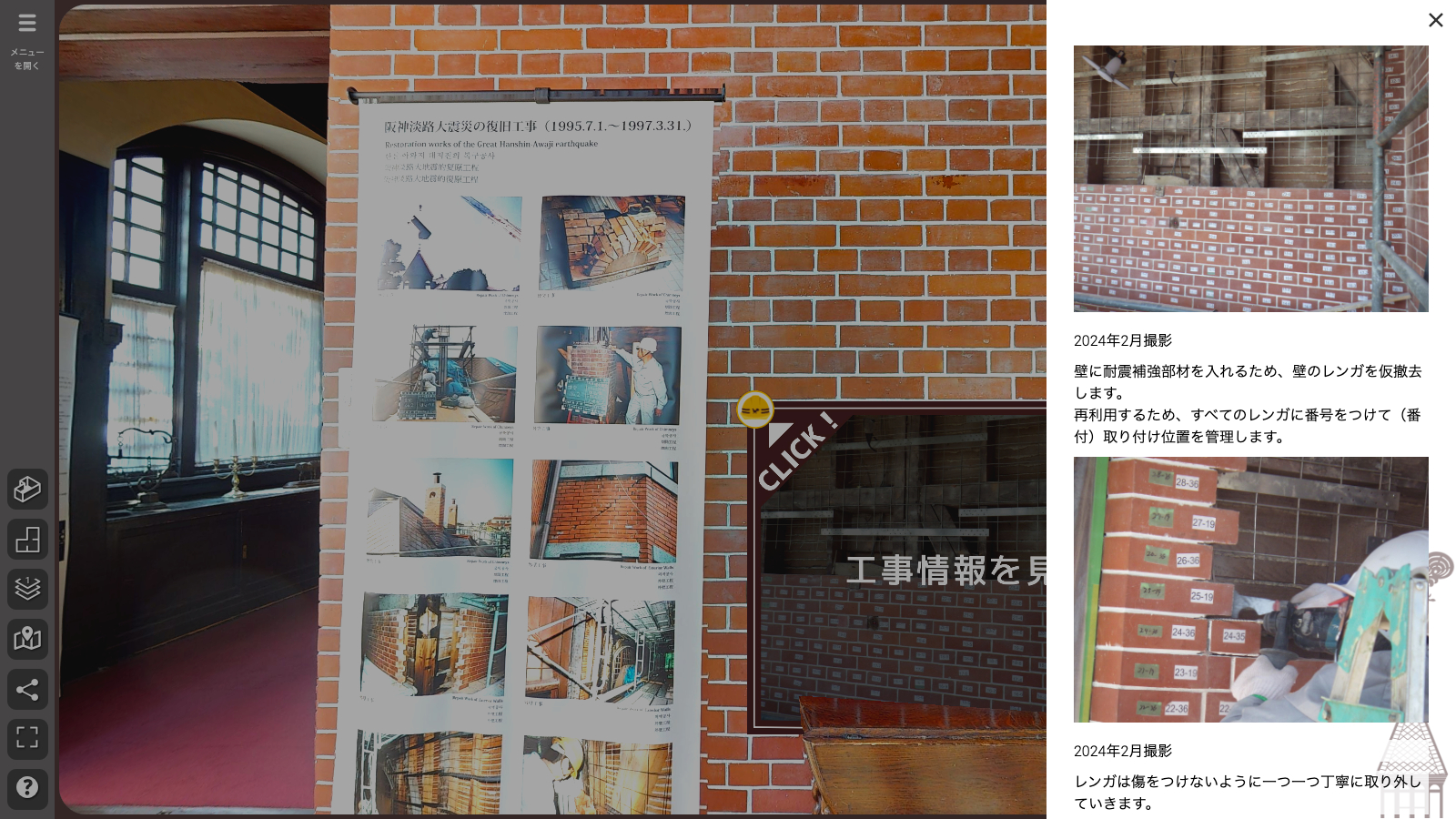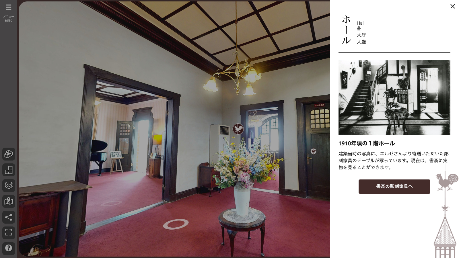 耐震工事に伴う長期休館にあたって、現地訪問にかわる機会としてバーチャル内覧を制作させていただきました。耐震工事の様子も順次情報更新をしながらお届けしていきます。